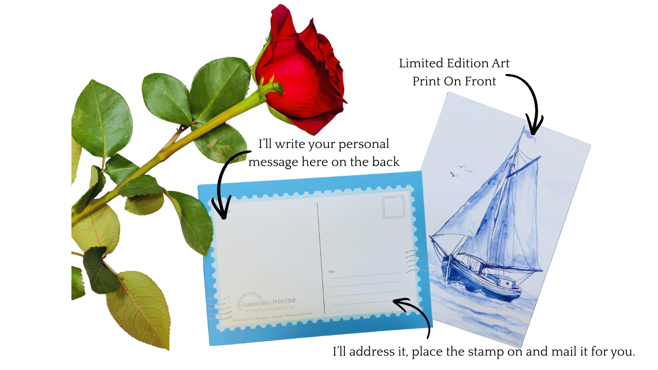 This limited edition art postcard features a print of my original artwork on the front and your handwritten message on the back. I’ll take care of the printing, writing, and mailing — so all you need to do is choose your beautiful words.